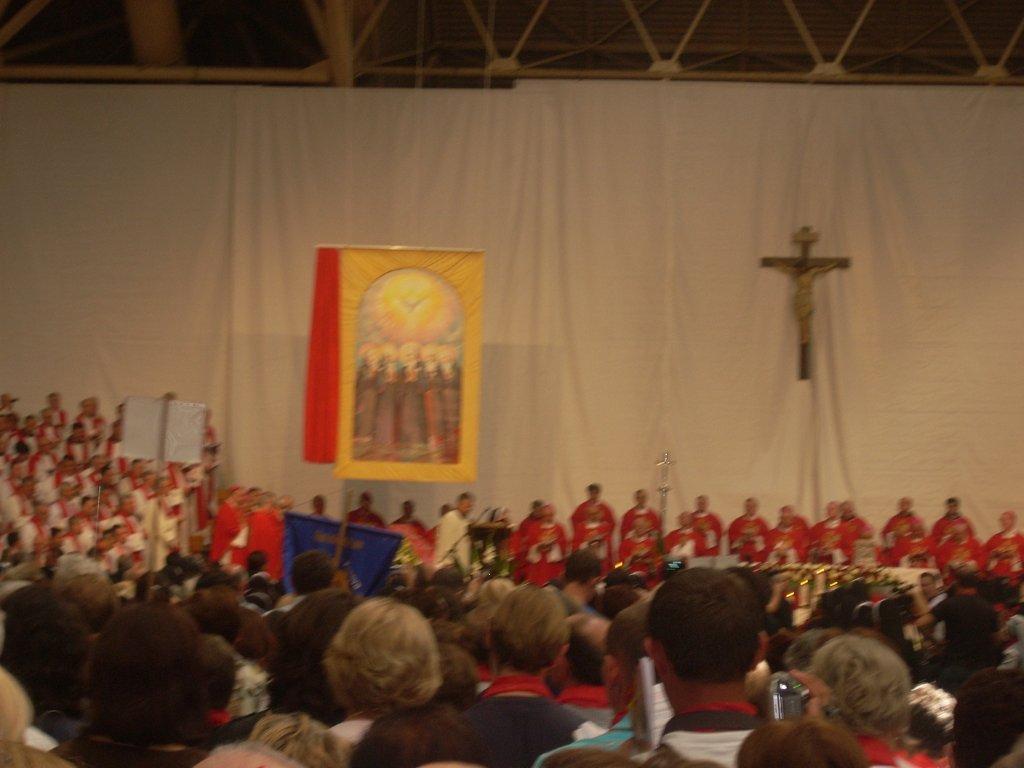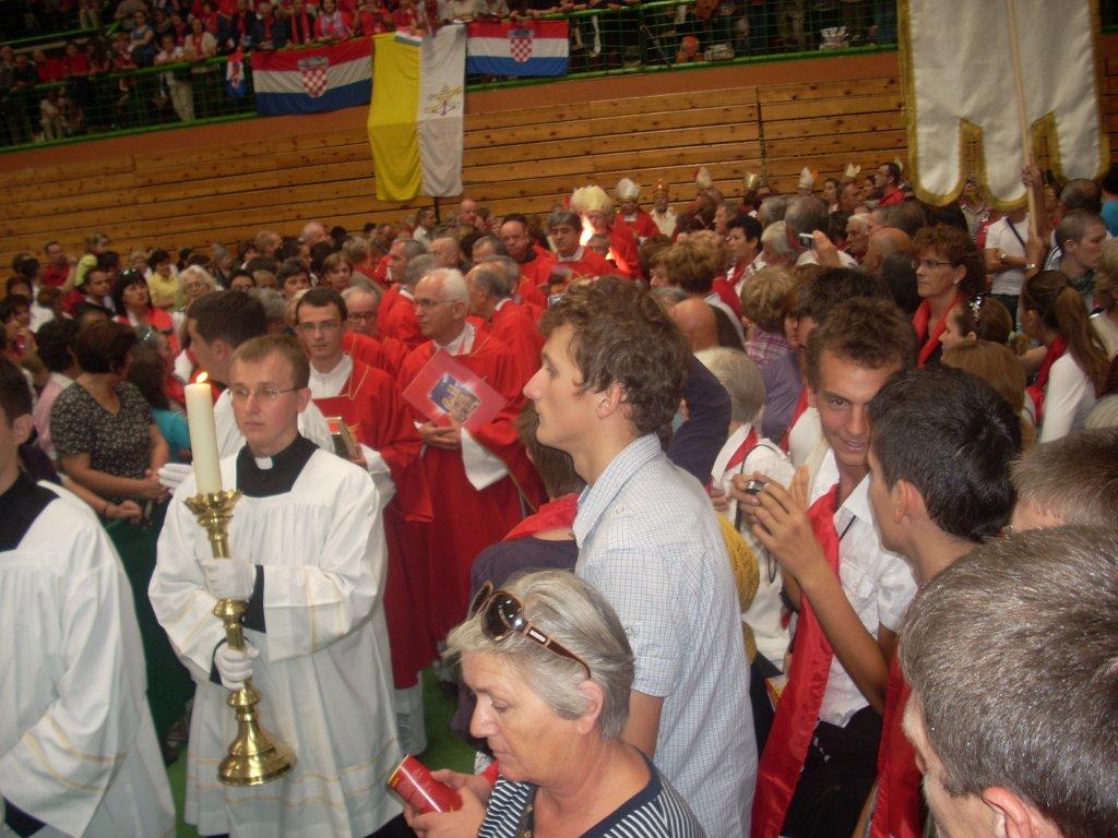 U 11 sati počela je sv.misa procesijom Papinog izaslanika, naših kardinala i svih biskupa. Na početku je bio Obred proglašenja blaženim sestara mučenica. Posebno je bilo dirljivo dok je kardinal Puljić javno čitao kratki životopis svake sestre: Jule, Berhmane, Krizine, Antonije i Bernadete. Nakon proglašenja blaženima otkrivena je slika blaženica postavljena pokraj oltarnoga prostora. Svetu misu je predvodio Papin izaslanik kardinal Angelo Amato. Pokraj skupine od nas desetak iz župe stajalo je nekoliko dječaka vrlo pristojnog ponašanja i izgleda. Bili su drugačiji od drugih mladih i pretpostavili smo da su sjemeništarci, a to su nam kasnije na upit i potvrdili, rekavši da su iz travničkog sjemeništa. Bogu hvala da ih ima ! Za vrijeme svete mise u cijeloj dvorani potpuni mir. Mir, pobožno sudjelovanje vjernika, dostojanstveno ponašanje, prekrasna, uzvišena atmosfera ! Svi kao jedna duša ! Nešto veliko! Posebno je snažan bio trenutak kad je kao relikvija blaženih mučenica prinesena posuda s vodom iz Drine. Drina kao njihov grob! U dvorani tišina. Misli lete i stvaraju sliku pogibije hrabrih, Bogu posvećenih, djevica. U srcu molitva, zahvala… Možda se sjećamo nekih svojih izrečenih, a pogaženih odluka… A one su ustrajale, ustrajale do zadnjeg trenutka, uz Božju pomoć koju su zazivale te noći 15. prosinca 1941.